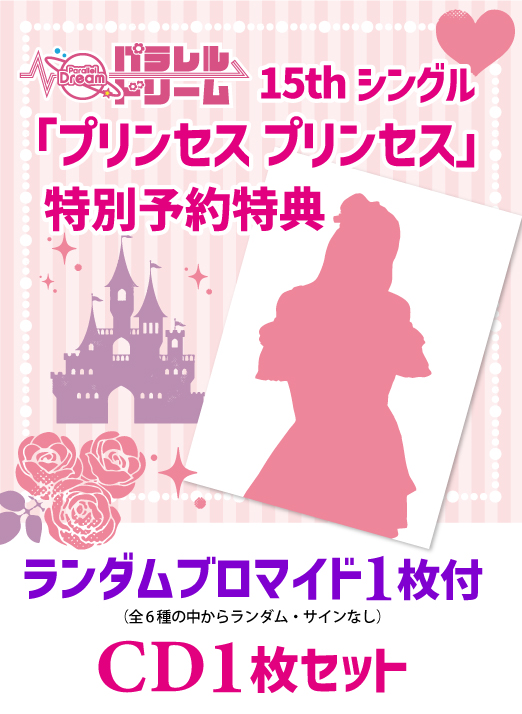 長野県から世界へ発信型アイドルユニット「パラレルドリーム」 15thシングルリリース! ●パラレルドリーム15thシングル「プリンセスプリンセス」特別予約特典● 【ランダムブロマイド1枚付 CD1枚セット】 40セット限定 L判サイズのブロマイドです。 ※全6種の中からランダム・サインなし。 ※CDへのサインがご不要な方はその旨を通信欄へご記載下さい。 【注意事項】 ・8/15(日)〜9/25(土)14:00までに事前予約いただいた方につく特別予約特典となります。 ・送料一律590円となります。 ・DM便での発送はお受けいたしておりません。 ・ご注文番号ごとに発送手続きを行う関係上、複数のご注文をおまとめする事はできません。 ※画像はイメージです