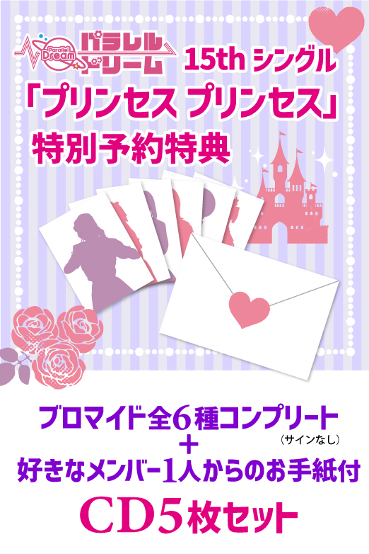 長野県から世界へ発信型アイドルユニット「パラレルドリーム」 15thシングルリリース! ●パラレルドリーム15thシングル「プリンセスプリンセス」特別予約特典● 【ブロマイド全6種コンプリート+好きなメンバー1人お手紙付 CD5枚セット】 50セット限定 ・ブロマイド全6種コンプリート(サインなし) L判サイズのブロマイドです。 ※CDへのサインがご不要な方はその旨を通信欄へご記載下さい。 【注意事項】 ・8/15(日)〜9/25(土)14:00までに事前予約いただいた方につく特別予約特典となります。 ・送料一律590円となります。 ・DM便での発送はお受けいたしておりません。 ・ご注文番号ごとに発送手続きを行う関係上、複数のご注文をおまとめする事はできません。 ※画像はイメージです